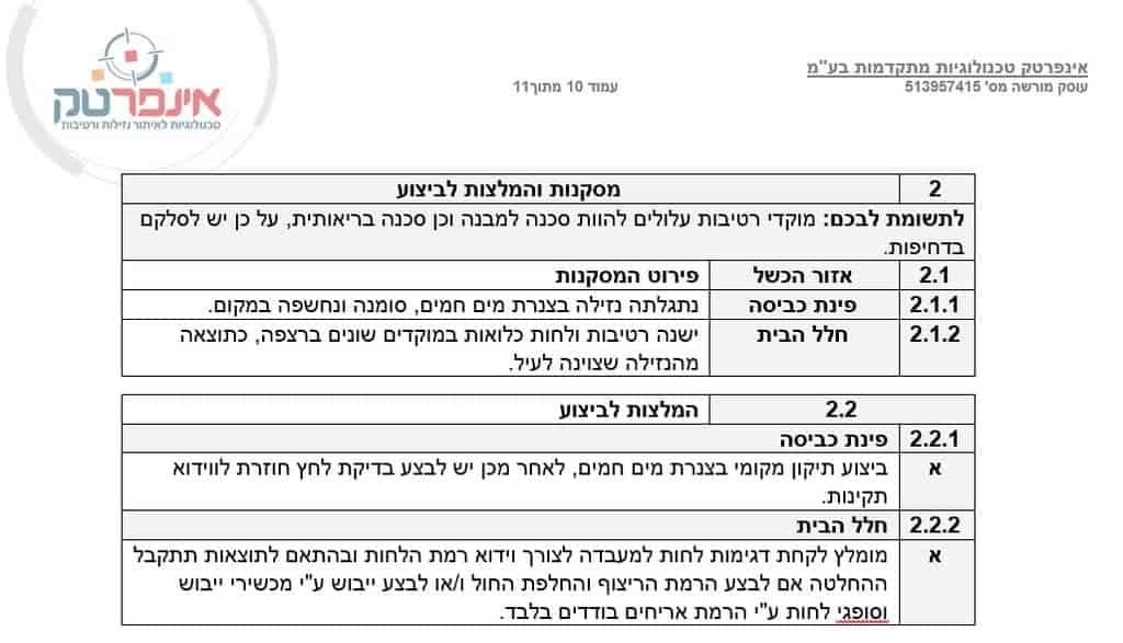 הדוח כולל ניתוח של מקורות הנזק, תיעוד שיטתי של הבדיקות שבוצעו, הסברים מדויקים בלשון הנדסית ברורה, המלצות לפתרון ומסקנות המתבססות על ניסיון מקצועי עמוק בשטח.